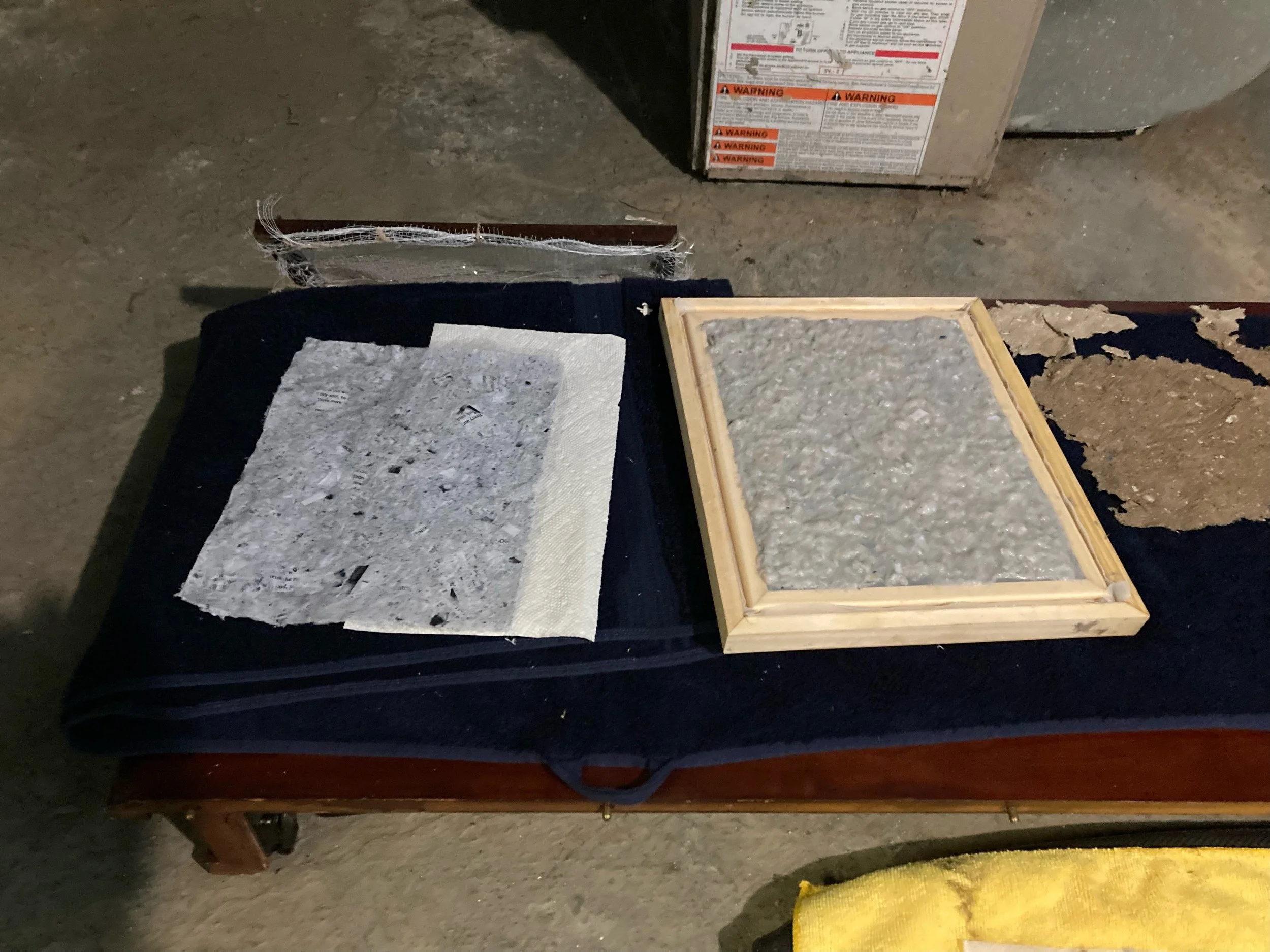 I moved to whiter scrap paper to get a few clean sheets. I dried all of my paper on the frames, which yielded a satisfying dual-sided texture. The mesh-side was smooth and the opposite was rough and tactile. During the wet stage, I was able to embed words into the sheets, which is what I used for the cover.