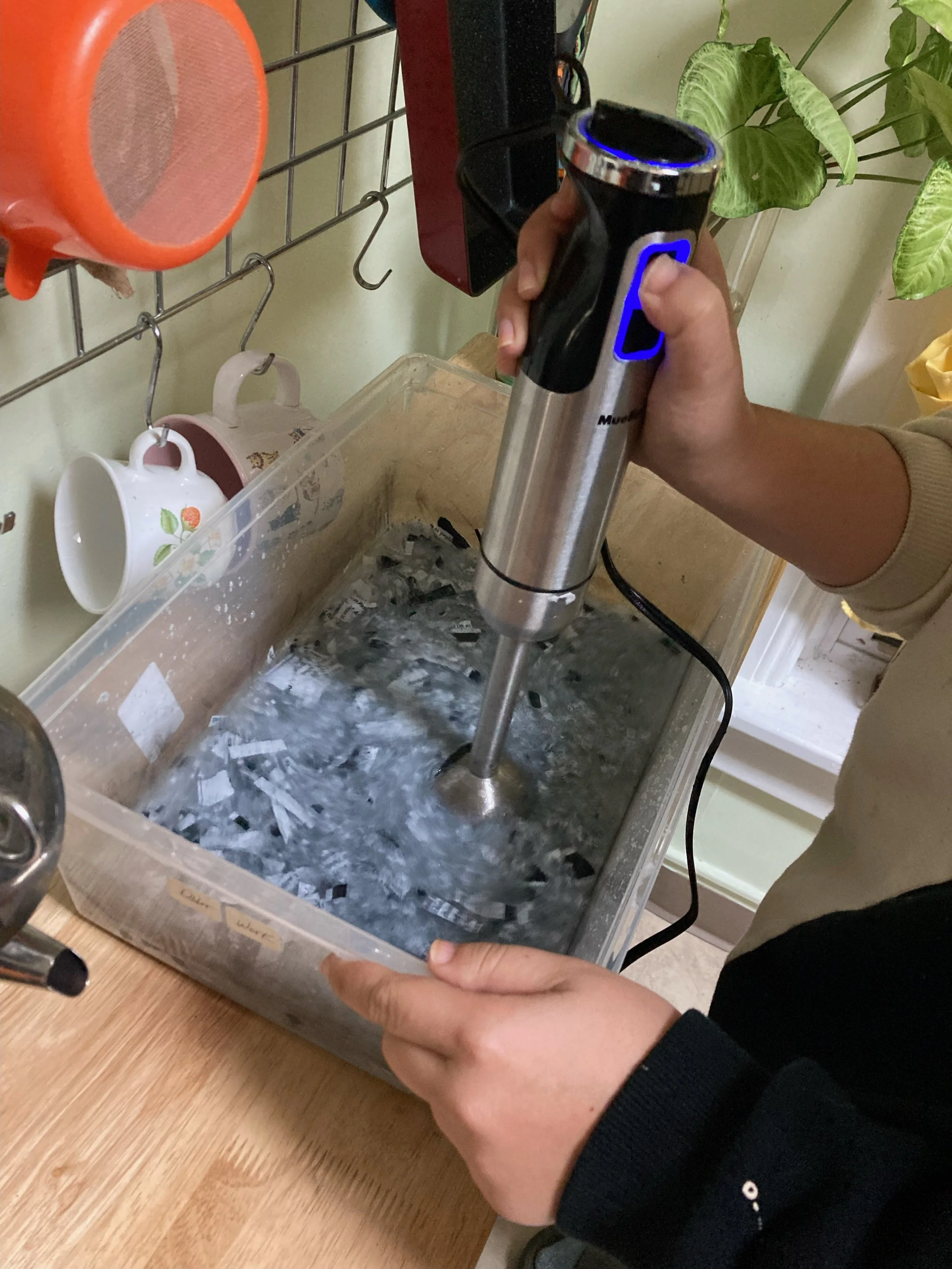 After sorting, I soaked the scraps in hot water and blended the mixture. Some paper took to blending better than others, and I found the smaller the better.