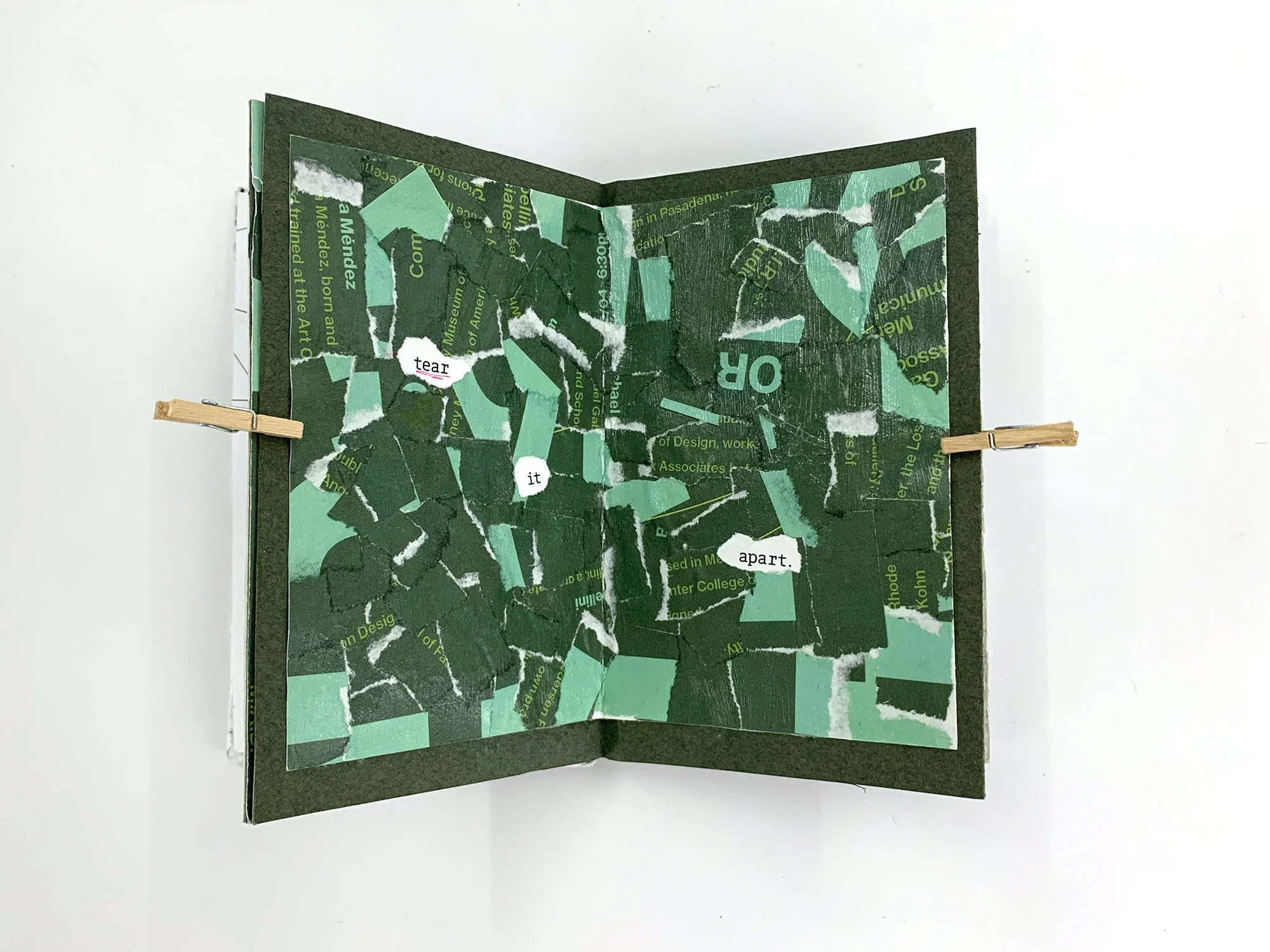 I embarked on the repetitive process of separating, tearing, and cutting my scrap paper. I set aside newspaper for my initial practice, then sorted the colors of my poster remnants. I had a vague idea of how I wanted my zine to look, and wanted to save a collection of pure white to make some cleaner pieces.